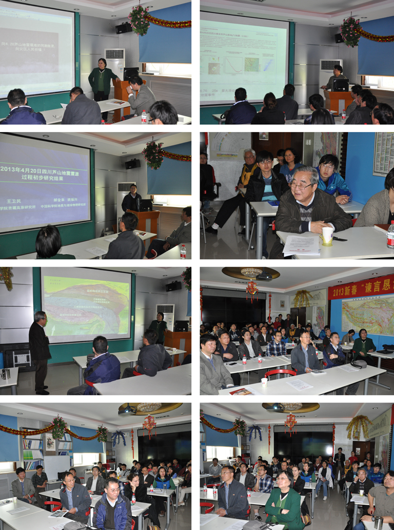 报告会上,李海兵研究员做了“雅安芦山地震(Ms7.0)现场考察及其发震构造分析”报告,从雅安芦山地震概况、现场地震灾情、发震构造分析、汶川科学钻探井(WFSD)中水位变化特征、未来地震趋势分析等几方面进行了阐述。中国科学院青藏高原研究所王卫民研究员做了题为“2013年4月20日四川芦山地震震源过程初步研究结果”的报告,展示了他们对于震源机制、震源破裂过程以及理论烈度的最新分析结果,认为雅安芦山地震是汶川地震的强余震。许志琴院士利用汶川科学钻探揭示的青藏高原东缘龙门山的结构,对发震断裂、主震、余震、以及未来可能的发震地区进行了分析,并提出了新的科学钻探工程计划。中国地震局邓启东院士介绍了大家关心的发震断裂的确定、是否属汶川地震余震、未来地震预测存在的争论,提出重视预测地震要放宽眼界,综合探索研究,为今后较准确地震预测打好基础。报告结束后,与会人员针对发震断裂及未来地震预测等问题开展了热烈的讨论。