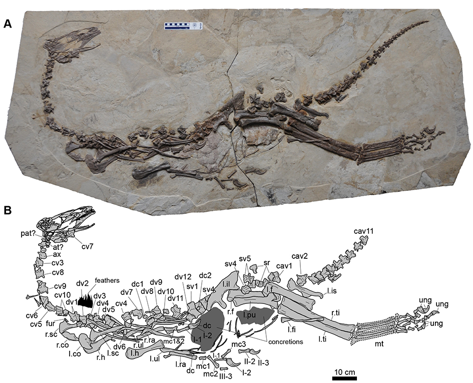 该标本产自约1亿2千5百万年的辽西建昌义县组,化石骨架基本完整,由河南省地质博物馆于2009年征集。研究小组于2010年开始对标本进行共同研究。结果表明,该标本属于兽脚类恐龙中的镰刀龙类恐龙新属种,命名为义县建昌龙(图1),其独特性在于它具有鸟臀类恐龙的牙齿排列方式。