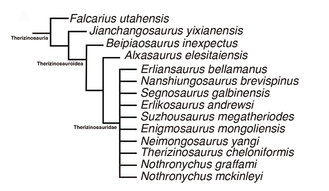 图2:镰刀龙的具有大的爪子 本次的研究结果具有以下重要意义: 1.亚洲最原始的镰刀龙类 支序系统学研究显示,建昌龙为镰刀龙超科的姊妹类群,比同一层位义县组发现的北票龙更原始。最原始的镰刀龙类是产自美国的铸镰龙属(Falcarius)。建昌龙要比铸镰龙属进步,而比北票龙原始,是亚洲最原始的镰刀龙类(图3)。