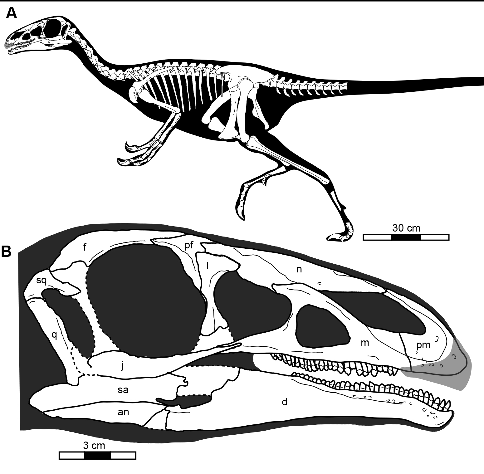 图4:建昌龙的骨骼复原(A)头骨复原(B)。 3.对兽脚类恐龙植食性演化的解释 建昌龙具有鸟臀类恐龙的牙齿和颌部构造,而其头后骨骼仍然显示兽脚类恐龙的特点, 比如后肢仍然细长适于奔跑。建昌龙的发现显示,镰刀龙类的演化是从头骨开始,逐渐过渡到头后骨骼的,即:演化早期,头骨(牙齿及颌部构造)为适应植食习性开始发生变化;演化后期,身体为容纳大量的食物变得更庞大。(图5)。 该研究成果发表在国际著名期刊《PLOS ONE》(2013年5月29日)上。