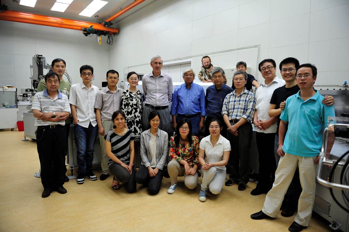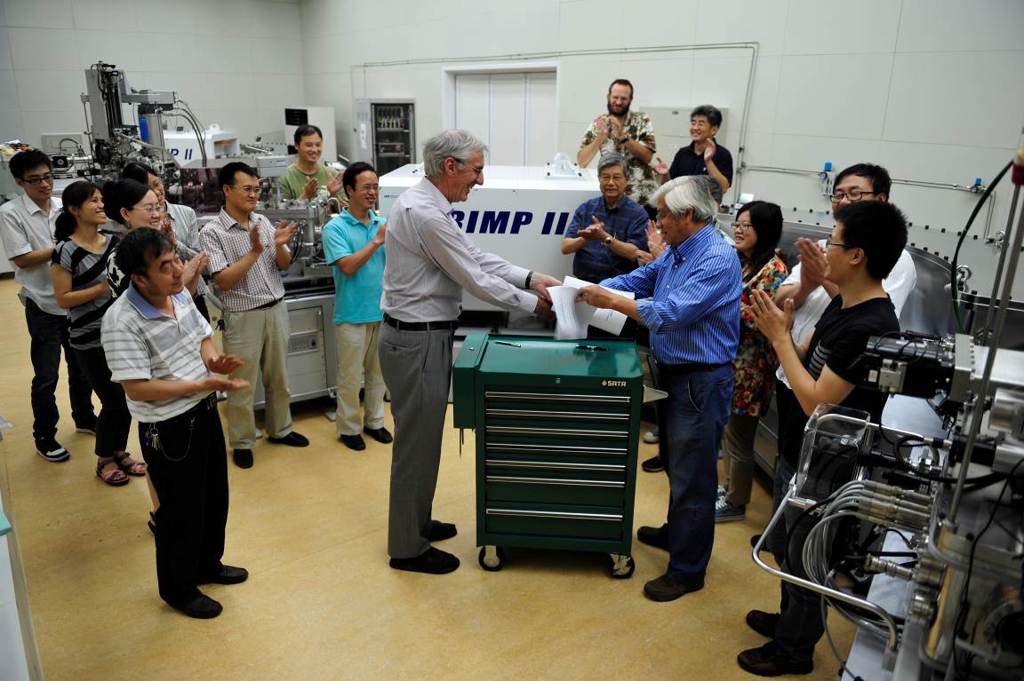 刘敦一研究员和Ian Williams博士共同签署SHRIMP安装调试验收报告 澳方技术人员与中心成员在验收仪式后合影留念