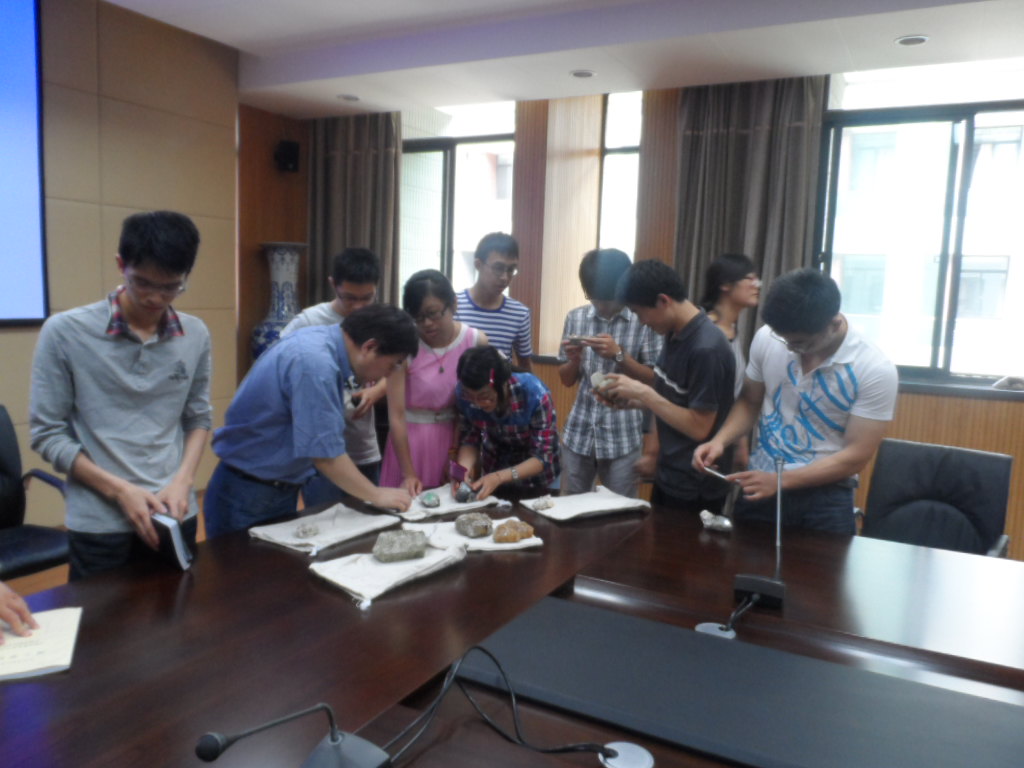 与会人员对雪宝顶矿床中的稀有金属花岗岩及其岩浆热液演化、成矿作用进行了讨论,并对这次讨论会上展示的精美的雪宝顶矿床典型的板状绿柱石、橘红色白钨矿、钾长石、钠长石、锡石、磷灰石等巨晶晶体成因进行了现场观摩和讨论。