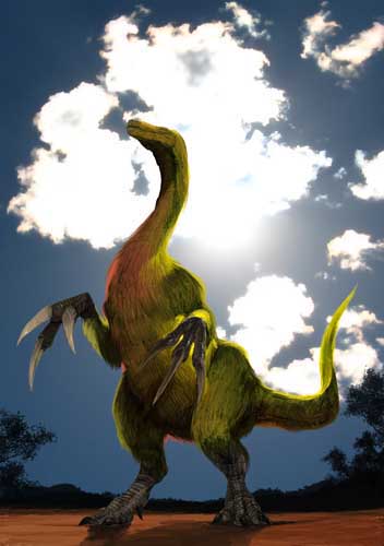 1923年,古生物学家在蒙古发现了一个巨大的化石前臂骨骼以及一些钩爪化石。其前臂骨竟然达到2.5米长,一些钩爪大约75厘米长——就像是用来除杂草的长柄大镰刀一样。于是,发现者将其命名为“龟型镰刀龙”,当时将其归入到巨海龟中。直到1990年,较完整的化石发现后,才知道镰刀龙是一种未知的庞大的恐龙。 外形奇特的镰刀龙是一种大型的靠两足行走的兽脚类恐龙,它生活在晚白垩世蒙古的戈壁沙漠上(当然,当时的戈壁沙漠并不像今天这样黄沙遍野、一片荒凉,而是植物繁盛、水草丰美的盛地)。镰刀龙尾巴不长而且比较僵直,这是因为在它的尾骨上长着被称为骨棒的支撑物。从镰刀龙骨骼构造上看,它比其它镰刀龙类恐龙要进化,其模式种长9.6米,重6.2吨,前肢很长,指上有锋利的爪子,同时还有粗壮的下肢,宽大的脚趾上也长着爪子,短尾,并且身上很可能覆有原始羽毛。至于镰刀龙的行走方式,一部分古生物学家认为,镰刀龙的前肢与后肢长度相近,估计是像大猩猩或爪兽那样行动。但是更多的古生物学家认为,它不应该是四肢着地的,因为它前肢的结构不适合支持体重,爪也比较碍事。 由于有关镰刀龙的骨骼化石并不齐备,因此,它的很多特征都属于猜测阶段,还有待于我们进一步去开发、挖掘。 |