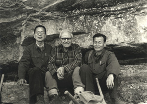 | 1978年邢裕盛和项礼文在三峡田家园子与国际前寒武 系-寒武系界线工作组主席J.W.考依合影. Xing Yusheng,Xiang Liwen and Chairman J.W.Koyi in SanXia in1978 |