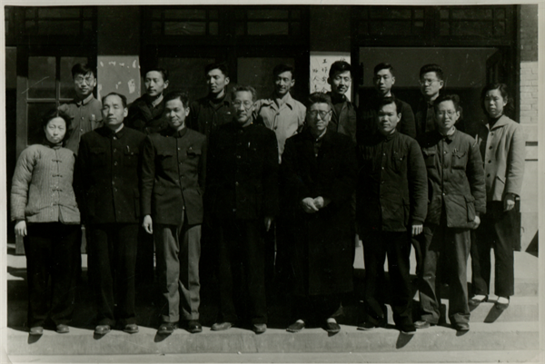 1960年冬,中国地质科学院第四室(原前寒武纪地质及变质岩研究室)成员与院领导合影,前排左起依次为:冯宁生、冯志爽(副院长)、程裕淇院士(副院长)、习东光(副院长)、王曰伦院士、谭树田(第四室行政副主任)、沈其韩院士;第二排左起依次为:王泽九、白云彬、任富根、崔永德、刘长安、陈荣辉、陆宗斌、王喆(室秘书)