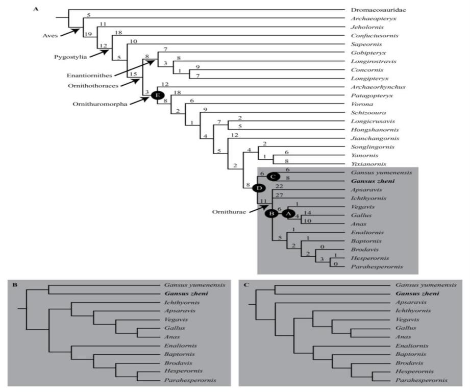 王旭日及其合作者通过与中生代不同鸟类化石的解剖学特征对比研究,发现这批标本与之前研究发表的玉门甘肃鸟特征最为相似:两者胸骨和乌喙骨结构特征相似;肱骨+尺骨/股骨+胫附骨比例接近;后肢近端趾节均长于远端趾节;第四趾节均长于第三趾节。但是两者之间也存在部分特征差异,如:前者叉骨的叉骨枝夹角远大于后者,前者第四趾稍长于第三趾节,而后者的第四趾节远长于第三趾节;后肢第三趾节与附趾骨比例差别较大等。尽管玉门甘肃鸟化石材料较多,但是没有一个完整个体。而新发现的化石材料不仅数量众多,且大都保存完整。因此,支序分类研究也证实,甄氏甘肃鸟与玉门甘肃鸟亲缘关系最近(图3)。
