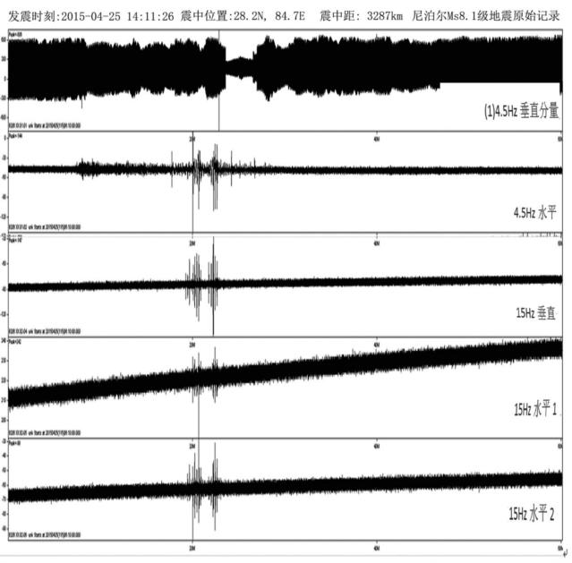 北京时间2015年4月5 日14:11:26,尼泊尔发生8.1级地震。大陆构造与动力学国家重点实验室东海地壳运动长期观测站观测到地震信号,震中距长期观测站 3287km。从记录可见,4.5赫兹水平分量信噪比最好,说明这是来自千里之外的强震。