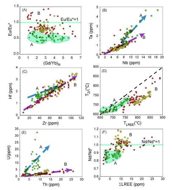除了碰撞早期(~43-45Ma)二云母花岗岩外,喜马拉雅渐新世以来的淡色花岗岩主要是变泥质岩部分熔融的产物,包含两类部分熔融作用—白云母脱水熔融作用(趋势-A)和水致白云母部分熔融作用(趋势-B)(图1)。与脱水熔融作用形成的淡色花岗岩相比,水致熔融作用产生的花岗岩具有较高的Ca、Sr、Ba、Zr、Hf、Th和LREE含量和Zr/Hf、Eu/Eu*和Nd/Nd*比值,但较低的Rb、Nb、Ta和U含量,较低的Rb/Sr、87Sr/86Sr和εHf(t)值 (图1和2)。这些主量元素,微量元素(大离子亲石元素、高场强元素、稀土元素)和Sr-Hf同位素的地球化学差异性受控于两类部分熔融作用过程中主要造岩矿物和副矿物的溶解行为。白云母和长石参与部分熔融作用的比例控制了熔体的Ca、Rb、Sr和Ba含量及Eu/Eu*、Rb/Sr和87Sr/86Sr比值,继承性锆石的差异性溶解控制了熔体的Zr、Hf、Zr/Hf和εHf(t),继承性独居石的溶解控制了熔体的Th、LREE和Nd/Nd*。这些新观测结果不仅验证的早期理论模拟和实验研究的预测,而且拓展了不同地壳深熔作用反应可导致熔体高场强元素变异和Sr-Hf同位素耦合等效应,为深入理解地壳深熔作用过程中元素和同位素地球化学行为提供了新限定,为深入理解花岗岩的元素和同位素特征的成因提供了新工具,为利用花岗岩的地球化学特征来反演地壳深部过程提供了新思路。