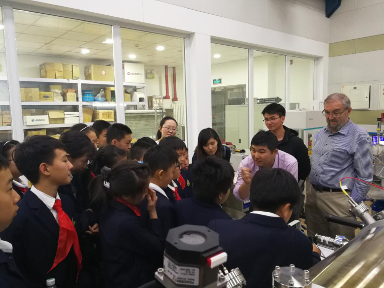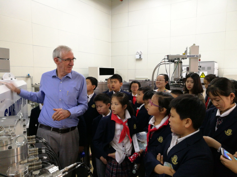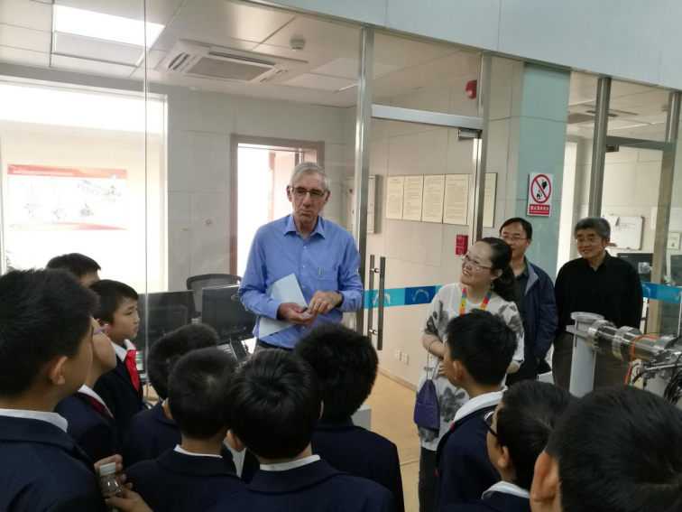 在离子探针中心,颉颃强副研究员向师生们做了一场题为“地球母亲的诞生和成长”的科普讲座,借助内容丰富、图片生动、观赏性极强的多媒体演示,以通俗易懂的语言介绍了地球的诞生及演化历史,讲述了地质年代学的发展历程,展示了中心科研人员在地球早期演化历史和月球年代学研究中所取得的重要成果,激发了学生们对地球科学的极大兴趣。随后,北大附小的师生们参观了北京离子探针中心的两台核心仪器—“高灵敏度、高分辨率二次离子探针质谱计(SHRIMP)”和中心的飞行时间二次离子质谱(TOF-SIMS)自主研发平台。正在中心进行客座访问的澳大利亚国立大学地球科学研究院Ian Williams教授和国际著名离子光学专家、SHRIMP仪器的两位主要发明人之一——加拿大Stephen Clement博士为学生们担任了实验室参观的讲解员。