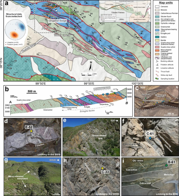 图1 北祁连清水沟HP/LT混杂岩地质背景(a)和野外露头(d–i)野外观察剖面(b)和卫星影像(c)多尺度指示了该区域大规模变硅质岩块体的出露