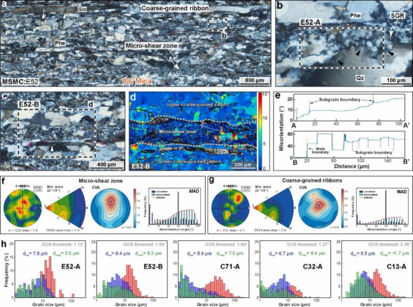 图2 清水沟变硅质岩块体内微剪切带的显微构造特征和EBSD分析结果 带内发育有典型的新生重结晶颗粒(红柱),且与亚颗粒(绿柱)的粒径分布(h)具有良好的一致性