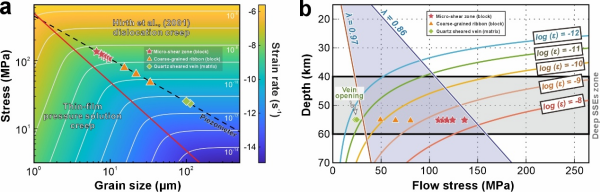 研究结果表明,这些变硅质岩块在约490 °C、15 kbar(埋深 55 km)的条件下经历了位错蠕变(dislocation creep)主导的变形过程。微剪切带记录的古应力水平普遍超过100 MPa,应变率可达~10-9 s-1,显著高于周围较软弱的钙质片岩基质(< 30 MPa)。这一鲜明对比揭示了俯冲界面内部存在强烈的应力非均一性(图3)。更为关键的是,有限应变测量与流变学计算显示,这些微剪切带的形成仅持续5–40年,其时间尺度和应变速率均与现代深部慢滑移事件(SSEs)近一致。