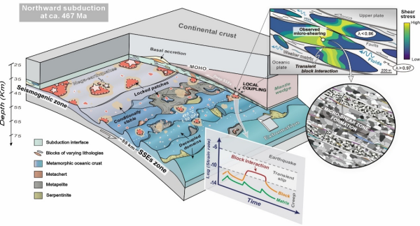 俯冲板片与上覆板块和地幔楔之间的俯冲界面是行星地球发生物理化学相互作用及物质和能量(热)交换最强烈的场所。现代地球物理观测揭示,在俯冲界面浅部孕震带(seismogenic zone, 10-35km)和深部蠕变带(creep zone,>50km)之间的过渡带(35–55 km 深度, 取决于俯冲带热梯度),频繁发生深部慢滑移事件(slow slip events, SSEs)。理解SSEs的成因与力学机制,是揭示俯冲界面耦合–解耦行为、认识慢地震周期演化的核心科学问题。然而,目前关于这一深度的构造过程和物理机制仍存在重大争议:应力在过渡带中究竟如何分布?为何俯冲界面能在长期稳态蠕变的背景下,触发瞬时高应变速率的局部事件?