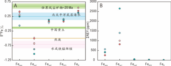 相比之下,结晶铁氧化物(Feox2)、层状硅酸盐结合铁(FeHCl)以及残余铁相(FeR)中的总稀土含量明显偏低,具有类似东亚沙漠矿物粉尘的稀土配分模式。它们的铁同位素组成逐渐变重(图1,δ56Fe = +0.05‰ ~ +0.55‰),高于中国黄土(主要来源于东亚沙漠风尘)的铁同位素组成,且部分接近估算的风尘矿物δ56Fe值。这一现象可归因于风尘在风化过程中残余铁保留了偏重的铁同位素,而进入海洋后活性铁组分中的铁优先溶解并释放较轻的铁同位素,导致最终深海沉积物中的残留尘源铁呈现较重的δ56Fe值。尽管这些残留的尘源铁相所含的稀土总量远低于海水自生铁相,但尘源铁作为深海沉积物的重要铁源,具有稀土的潜力。