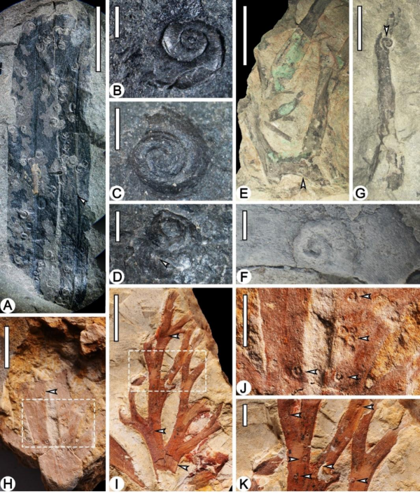 生物如何扩散与传播,是生物地理学研究的核心科学问题之一,而非远洋生物(如浅海、陆生生物)的全球扩散现象尤其引人关注。对化石记录以及现代生态系统研究表明,陆生脊椎动物(如蜥蜴)、微螺虫、昆虫、双壳类、珊瑚等均可借助浮木等载体实现跨洋迁移。但是,对于非远洋生物借助植物残骸进行跨洋扩散这一现象的起源及其生态效应仍知之甚少。栖息于晚奥陶世至中侏罗世的浅海或河流环境的微螺虫能够固着在多种基底上生活,包括维管植物(图1)、腕足动物、层孔虫等,并且其化石记录与维管植物的起源时间存在重叠,成为探究早期维管植物是否具备“生物筏”功能的重要研究对象。