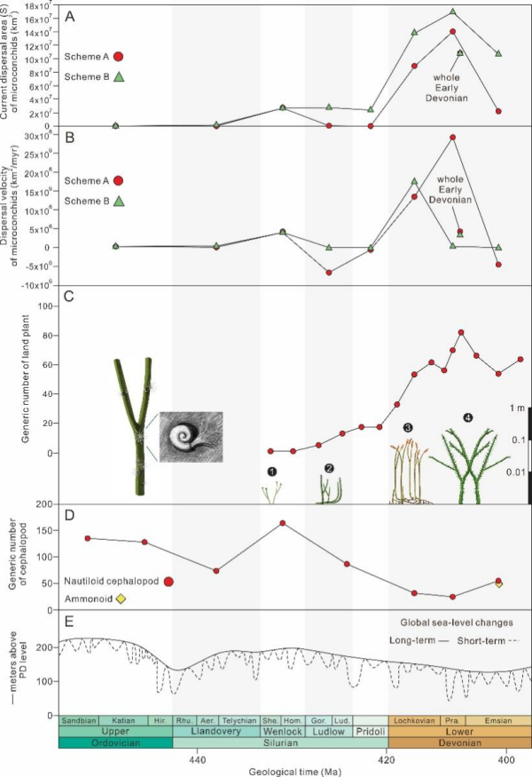 图2. 晚奥陶世至早泥盆世微螺虫的扩散面积(A)和扩散速率(B)、维管植物演化(C)、头足类多样性(D)和全球海平面(E)变化
