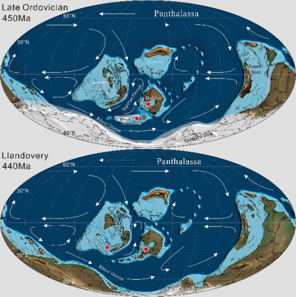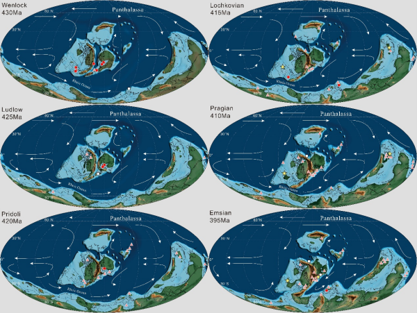 图3. 晚奥陶世至兰多维列世微螺虫的全球分布(红圈为微螺虫;白箭头为表层洋流方向)