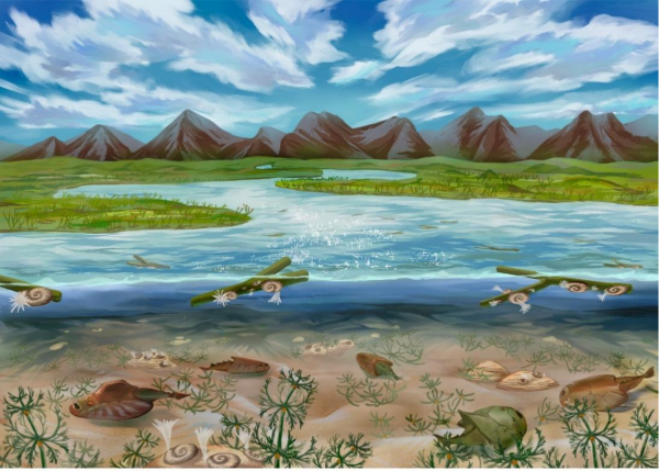 图5. 艺术复原图,展示了早泥盆世微螺虫固着在维管植物残骸上漂流。图/李美滋绘制