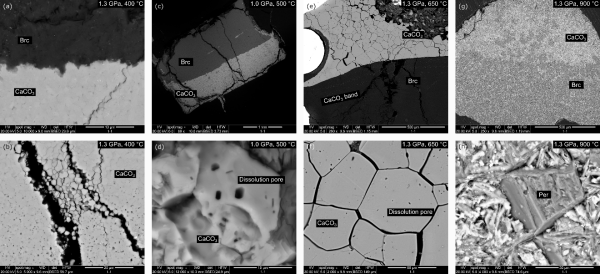 在200–650 °C的较低温度区间(对应典型的浅部俯冲带环境),碳酸钙-水镁石体系内并未发生显著的脱水或还原反应,而是通过流体介导发生了Ca-Mg离子交换反应,生成羟钙石(氢氧化钙,Ca(OH)2)和菱镁矿(MgCO3)等矿物(图1)。这一发现表明,板片中初始含水矿物中的水,可以在俯冲带浅部通过反应封存于羟钙石中,并随板片俯冲深入地幔过渡带,羟钙石也因此成为一种重要的深部水运移潜在载体。
