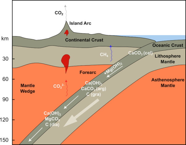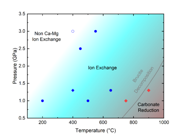 俯冲带是地球深部物质交换与水碳循环的关键枢纽。在俯冲洋壳与上覆沉积物中,碳酸盐(主要为碳酸钙,CaCO3)和由超镁铁质岩石水热蚀变形成的含水矿物(如水镁石,Mg(OH)2)分别是重要的碳和水挥发分载体。前人研究多将碳酸盐矿物与含水矿物的物理化学行为分开独立讨论,缺乏对二者协同作用的系统分析。在浅部俯冲带富含水镁石的硅不饱和环境(如蛇纹石化断裂带)中,这两种常见矿物之间的化学相互作用及其对深部水-碳耦合循环的潜在影响,此前较少有系统的实验研究。