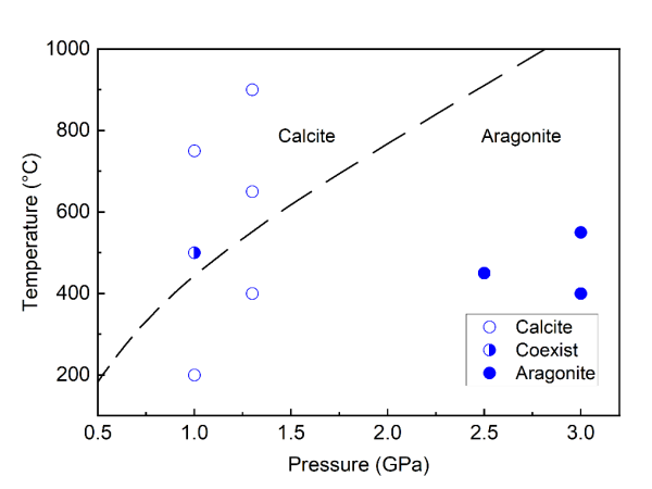 图3 淬火样品中碳酸钙相态随温压条件的变化图解