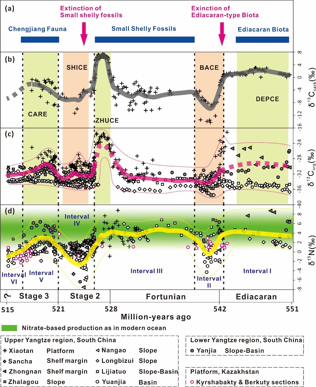 2018年7月3日,《自然通讯》(Nature Communications)在线发表了中国地质科学院地质研究所朱祥坤研究员课题组、南京大学凌洪飞教授课题组与国内外其他单位的合作研究论文“埃迪卡拉纪—寒武纪转折期海洋氧化-还原状态与动物演化的耦合关系(Coupling of ocean redox and animal evolution during the Ediacaran-Cambrian transition)”。该成果以氮同位素为主要研究手段,发现距今约5.51-5.15亿年前的埃迪卡拉纪—寒武纪转折期海洋氧化-还原状态呈现阶段性波动变化,时间上与早期后生动物的阶段性辐射和灭绝事件高度吻合。这一新的研究成果不仅有助于解决该时期古海洋氧化程度的争议,还为解答地球动物的“寒武纪大爆发”之谜提供了新的视角,是地球生命与环境协同演化领域的一项重大研究进展。