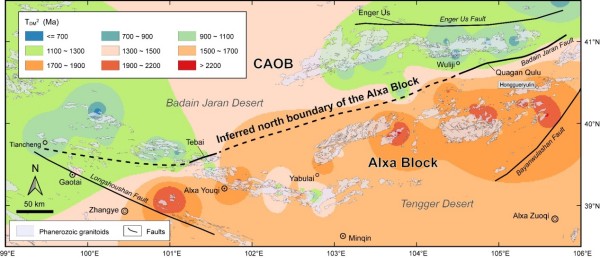 中亚造山带是全球最大的显生宙增生造山带和地壳生长区。精确厘定其边界对于深入认识整个中亚造山带的形成与演化过程至关重要。前人通过大量地表地质的研究,基本确定了中亚造山带边界的位置,特别是其南缘与华北-塔里木克拉通的边界。但是在一些地区,造山带与克拉通的边界认识不一,成为亟须解决的重要问题。例如,中亚造山带与阿拉善地块的边界通常被认为是恩格乌苏蛇绿岩带,但近年来也有研究提出可能是其南部的查干础鲁蛇绿岩带。这些界限如何延伸到阿拉善西部,也缺乏精细的限定。针对上述问题,中国地质科学院地质研究所张磊副研究员、王涛研究员、张建军副研究员等通过岩浆岩同位素示踪方法揭示不同构造单元深部物质组成的异同,为中亚造山带与阿拉善地块边界的厘定提供了新的依据。