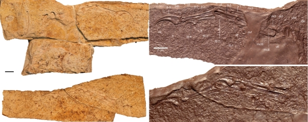 近十年来,内蒙古大兴安岭地区鸽子山化石点发现了一系列热河生物群脊椎动物化石,包括鱼类、两栖类、龟鳖类、有鳞类、恐龙和鸟类等,为相关动物群的系统发育和古地理分布以及热河生物群的辐射演化研究提供了重要化石证据。近日,中国地质科学院地质研究所王旭日研究员通过与吉林大学、莱阳白垩纪国家地质公园及意大利的古生物专家合作,对发现于鸽子山化石点的几件恐龙化石开展了深入研究。研究材料包括以独板形式关联保存的左、右前肢,以正副模形式关联保存的腰带和股骨,以及以独板形式关联保存的左、右蹠骨。由于无法证实这些骨骼属于同一个体,因此分别对化石标本开展了鉴定工作和深入研究。本研究取得以下主要研究成果:
