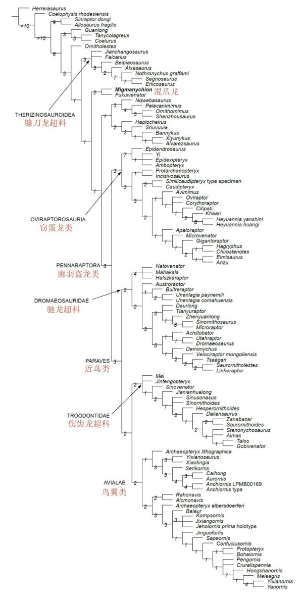 由于化石材料较少,目前的系统发育分析主要根据混爪龙的前肢特征。结果表明,混爪龙与福井猎龙亲缘关系最近,两者互为姊妹群,并组成一个单系类群(图2)。该类群与廓羽盗龙类的亲缘关系更近于镰刀龙类。混爪龙的系统发育位置及与其他兽脚类恐龙的亲缘关系还有待发现更多的化石材料进行佐证和明确。