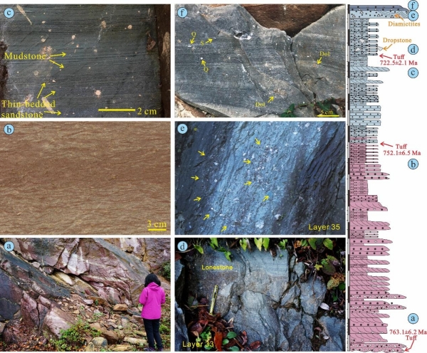 研究表明扬子克拉通北缘拉伸纪晚期-成冰纪早期的沉积演化过程受构造-气候共同驱动:扬子克拉通北缘新元古代初始沉积时代限定在763 Ma,以陆相洪积作用为主,物源来自南秦岭岩浆弧带;752 Ma时,从河流主导的陆相沉积体系转变为海侵-潮汐影响的海相体系,此时也是罗迪尼亚超大陆裂解相关的裂谷发育峰期;723 Ma后温室气候向冰室气候过渡(对应莲沱组上部),表现为浅海相灰绿色砂泥岩韵律向发育坠石的冰海相沉积(冰筏)过渡;而正式进入“雪球地球”期,则是以厚度不大的古城组冰碛杂砾岩为标志(图1和图2)。同时研究证实扬子北缘古城组冰碛岩与扬子东南缘长安组冰碛岩均为斯图特冰期产物,两地冰期同时启动。