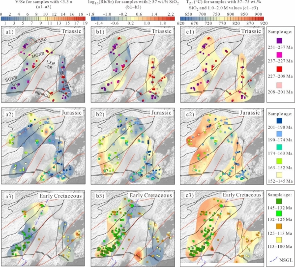 图2 东北地区三叠纪(a1-c1)、侏罗世(a2-c2)和早白垩世(a3-c3)岩浆岩V/Sc、log10Rb/Sr、锆饱和温度(TZr)空间等值线图(详细信息参见原文)