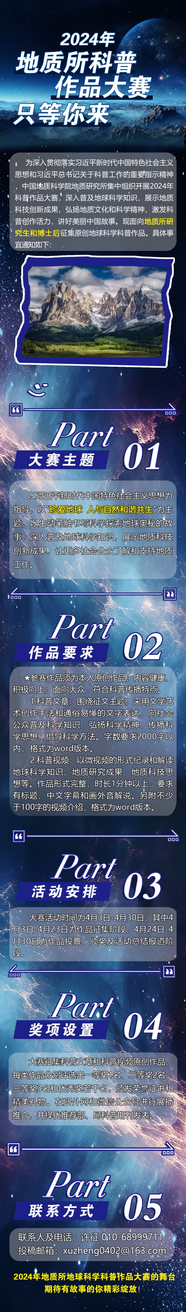 为深入贯彻落实习近平新时代中国特色社会主义思想和习近平总书记关于科普工作的重要指示精神,中国地质科学院地质研究所集中组织开展2024年科普作品大赛,深入普及地球科学知识,展示地质科技创新成果,弘扬地质文化和科学精神,激发科普创作活力,讲好美丽中国故事。现面向地质所研究生和博士后征集原创地球科学科普作品。具体事宜通知如下:
