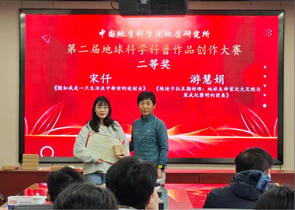迟振卿副所长对获奖同学表示祝贺,并鼓励大家继续践行热爱科学、崇尚科学的社会风尚,通过科普将所学的知识、所做的研究更好地推广与普及,激发公众对地质科学的兴趣。