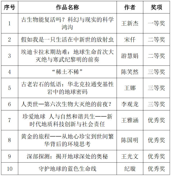 本届活动启动以来,博士后和研究生积极参与,一批兼具创新性、艺术性和地质科学内涵的作品脱颖而出。经过专业评审,最终评出一等奖1个,二等奖2个,三等奖3个,优秀奖4个。参赛作品围绕当下地学领域热点话题,以多维视角展示地质工作与成果,内容涵盖古生物的灭绝与生命大爆发的演化过程、地球深部的秘密如何通过技术手段来认识、古老岩石记录的地球的秘密、矿物金的形成历程和稀土的作用,以及海岸地貌特征等。同学们以生动笔触书写科学探索地球奥秘,诠释身边地学知识,传播地球科学理念,展示地学的魅力与和自然资源价值。