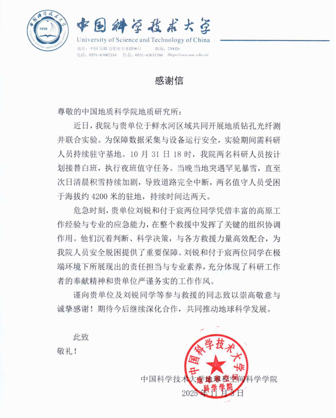 感谢信中特别提到,两位同学在极端环境下展现的责任担当与专业素养,不仅体现了科研工作者的奉献精神,更彰显了我所以实际行动践行立德树人的育人理念和严谨务实的工作作风。据了解,刘锐、付于宸日常深耕地质科研一线,长期参与高原野外考察,兼具扎实的专业能力与应急处置经验,此次救援正是其日常积累与综合素养的集中体现。