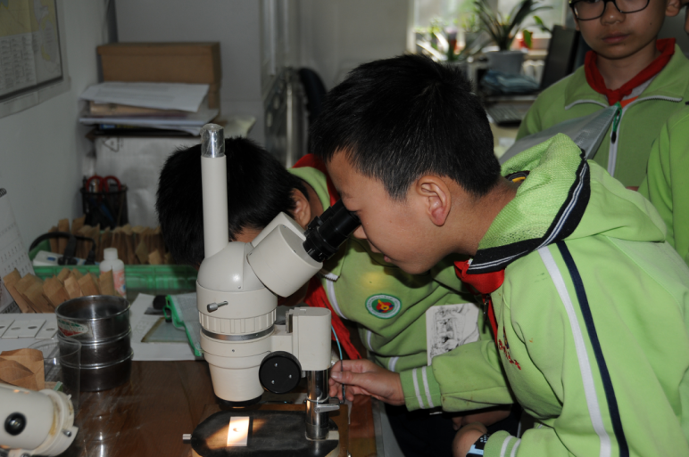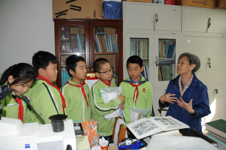 在地质所本部,科普活动分为三个环节展开:一是邀请吕君昌研究员作了一场题为“窃蛋龙窃蛋之谜”的科普讲座,他从窃蛋龙的命名、国际和国内发现的窃蛋龙化石和窃蛋龙的习性等方面,图文并茂、深入浅出地为东四九条小学师生上了一堂生动的古生物课,并就恐龙的知识开展了趣味问答,为回答正确的同学颁发了奖品。二是古生物化石保护基金会工作人员为师生们播放了《李四光》专题片,并赠送了地球奥秘科普系列丛书。三是,地质所科研人员带领东四九条师生参观了国土资源部地层古生物重点实验室。实验室主任纪占胜研究员结合地球生命孕育、演化和地质历史的画廊,为同学们普及了单细胞生物进化至人类的演化过程。同学们在科学家手把手式的指导下,在显微镜下亲眼观察了古生物化石的形貌,一睹微观世界的奇妙神秘。地层古生物实验室的科研人员用他们的热情和专业给东四九条小学师生们提供了一场知识的盛宴。