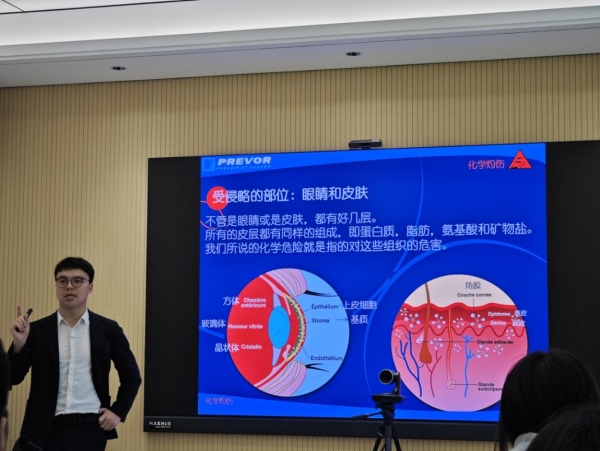 会上,王先珊工程师从危险化学品理化特性、危化品操作规范要求、危化品应急处置三个方面进行了讲解;重点讲解了危化品泄漏、触碰皮肤等紧急情况的应急处置流程和措施,包括如何正确冲洗、冲洗试剂使用流程、送医处置等,列举了大量的生动的事例,结合自身工作经历,讲授了危化品使用安全的重要性。
