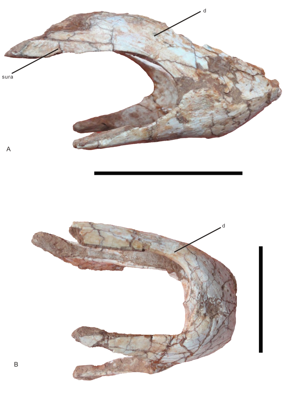 图1. 南康龙的下颌侧视和腹视,比例尺为5 cm