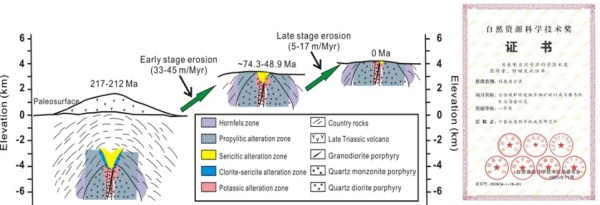 自然资源科技进步奖一等奖《古特提斯阶段斑岩铜矿的形成与保存机制及勘查示范》成果依托国土资源部公益性行业科研专项、国家自然科学基金、中国地质调查局地质调查项目及云南铜业股份有限公司地质勘查项目,基于对古特提斯阶段斑岩矿床的系统研究,成功揭示了缺氧环境的斑岩铜矿形成机理,突破了传统成矿理论认知,为全球找矿勘查提供了全新模型。(1)发现成矿斑岩母岩浆同样具有较高的氧逸度,浅部地壳多级岩浆房演化导致其氧逸度降低,提出古特提斯岩浆弧具有良好的成矿潜力,基性岩浆的注入是制约斑岩成矿的关键因素。(2)发现古特提斯域斑岩矿床具有强烈叠加的蚀变分带模式,揭示铜矿化主要形成于晚期绿泥石-绿帘石-绢云母化阶段,挑战了铜主要沉淀于早期钾硅酸盐化阶段的经典观点。(3)发现残留准平原是古特提斯域斑岩矿床得以保存的关键地貌条件,建立了斑岩矿床冷却与剥蚀过程定量化研究方法和成矿潜力评价指标体系,开展了勘查示范并实现增储。8 篇代表性论文主要发表在Economic Geology及Society of Economic Geologists Special Publication上(5篇),SCI 他引424 次。