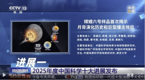 2026年3月25日,国家自然科学基金委员会党组书记、主任窦贤康在2026中关村论坛年会开幕式上发布了2025年度“中国科学十大进展”。由中国科学院地质与地球物理研究所、广州地球化学研究所、国家天文台、中国地质科学院地质研究所和南京大学等单位共同完成的“嫦娥六号样品首次揭示月背演化历史和巨型撞击效应”成功入选。该成果基于对嫦娥六号返回样品的系统研究,取得了一系列首创性的关键进展:识别出具有撞击成因的新型月球岩石,厘定月球最大撞击盆地——SPA盆地及其内部的阿波罗盆地分别形成于42.5亿年前和41.6亿年前,为认识月球早期撞击历史提供关键时标;首次获得月球背面月幔的水含量和化学组成,发现其比正面月幔更“干”,且锶—钕同位素组成更为亏损,铀—铅同位素比值偏离正面月幔演化曲线,揭示巨型撞击改造了SPA盆地之下的月幔性质;首次获得月背古磁场信息,明确月球磁场强度在28亿年前发生反弹,揭示月球磁场并非单调衰减而是存在波动。该系列成果将月球正面和背面表壳不对称性延伸至深部月幔,刷新人类对月球古磁场时空分布的认知,重塑了内太阳系早期撞击历史及其效应,引领月球科学研究迈向内、外动力系统耦合认知的新阶段。该成果标志着我国在月球背面探索领域实现率先突破,为未来月球采样任务提供了关键科学参考,显著提升了我国在行星科学领域的国际影响力;并引起广泛的社会关注,激发了公众对月球和行星科学的浓厚兴趣,有力推动了科学知识的普及。