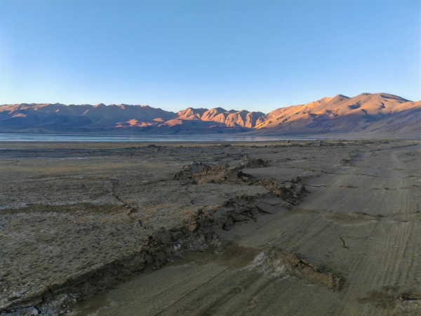 团队通过中国地质调查局自然资源航空物探遥感中心获取了震中地区遥感影像。通过对国产高分二号卫星震前、震后光学影像的解译和匹配计算,发现在尼辖错湖以北发育约4千米长的同震地表破裂带(图1),在登么错湖东岸断续分布约10km长的形变带,推测可能是湖岸松散堆积物因地震震动引起的滑塌挤压作用形成的挤压鼓包和张裂隙(图2,图3)。震前、震后影像亚像素匹配结果显示,尽管这次地震是典型的正断事件,但由于发震断层走向近SN且倾角较缓,破裂带两侧地表水平位移显著(图1C,D,E,F):东西向伸展量最大可达3.9米(平均约2.5米),根据美国地质调查局(USGS)的震源机制解结果(断层倾角49°),推测本次地震的最大垂直位错量在4米以上,同时伴随平均约1米的左行走滑(最大约1.9米)。