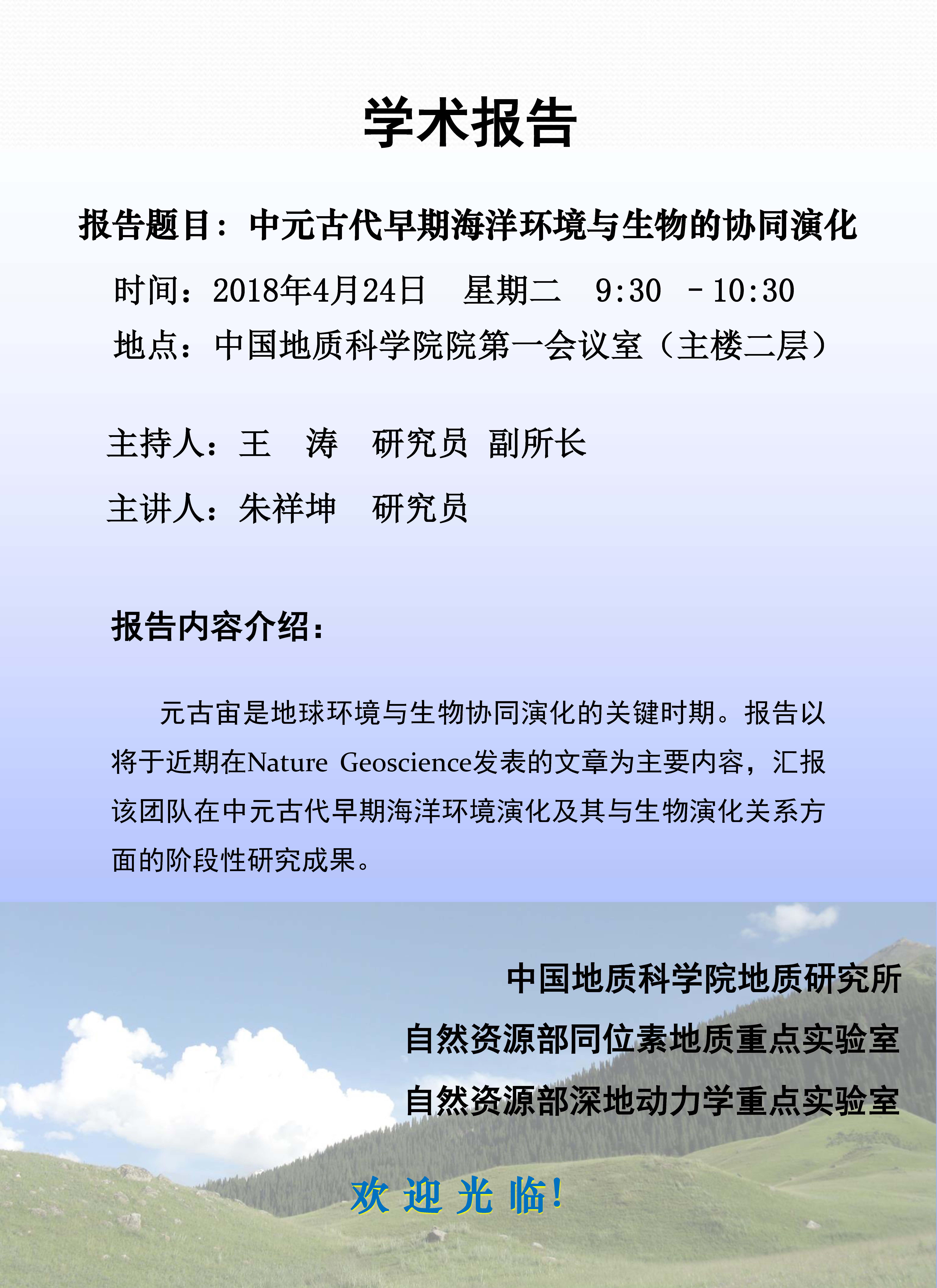 【04.24】朱祥坤研究员Nature Geoscience学术成果报告:中元古代早期海洋环境与生物的协同演化