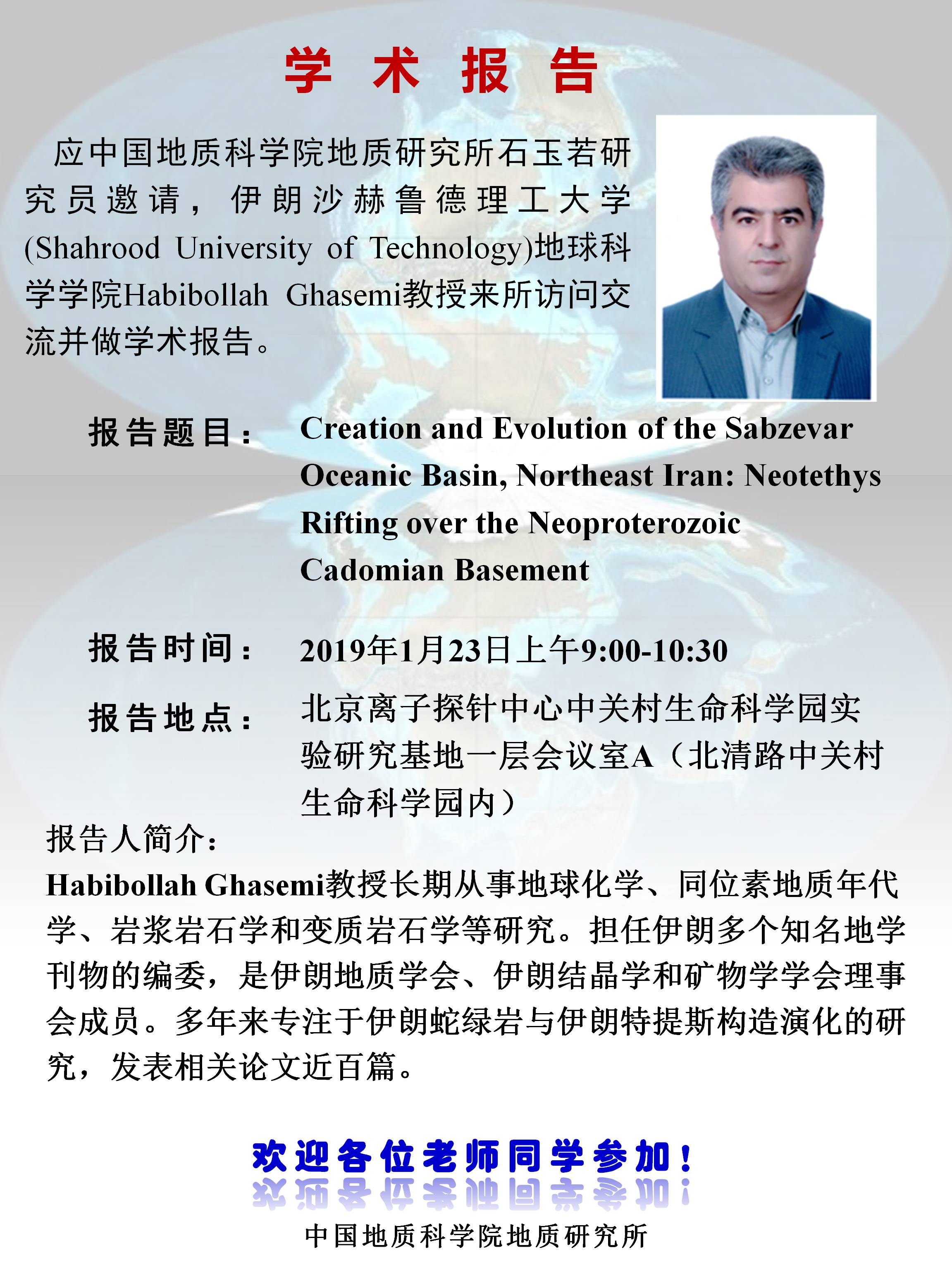 【01.23】伊朗沙赫鲁德理工大学Habibollah Ghasemi教授报告:Creation and Evolution of the Sabzevar Oceanic Basin, Northeast Iran: Neotethys Rifting over the Neoproterozoic Cadomian Basement