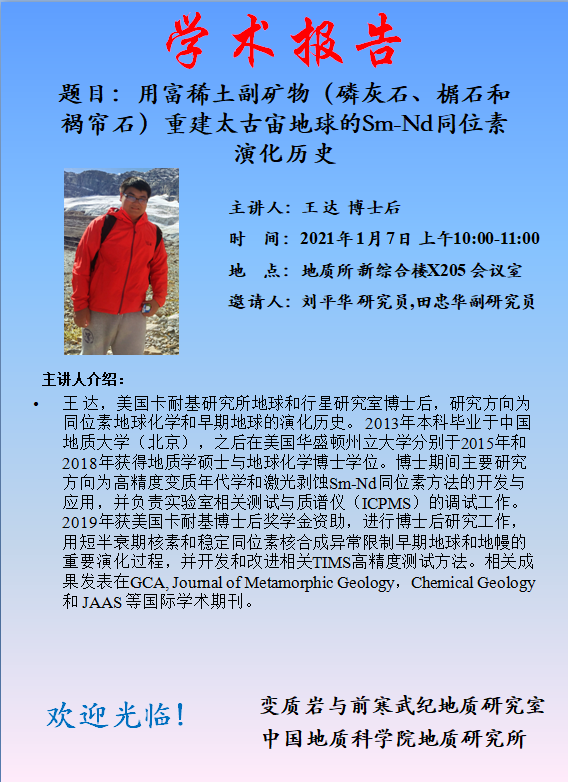 【01.07】王达博士后:用富稀土副矿物(磷灰石、榍石和褐帘石)重建太古宙地球的Sm-Nd同位素演化历史